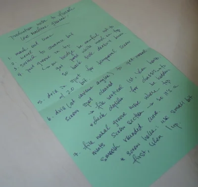 Sara's framemaking notes. It's always easy to make the first pair, but to get the second pair to look exactly like the first requires good note taking and reference pictures.
